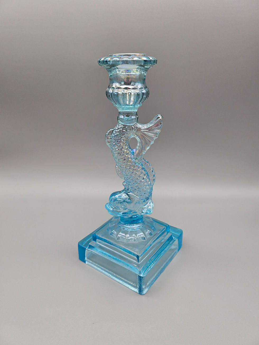 Imperial Glass Iridescent Teal Aqua Blue Koi Fish Dolphin Candlestick Holder
